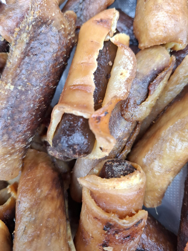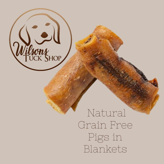 Wilson loves these scrumptious treats. He says he likes to eat the crunchy pork rind to find a surprise chicken sausage inside delicious rind to find a surprise chicken sausage inside delicious